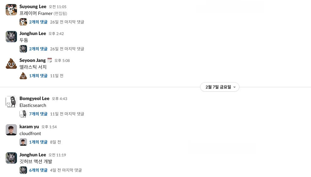 그리고 이건 또 다른 문화인데요. 혹시 슬랙에 있는 도메인 지식 채널이라고 아시나요? 저희가 이번에 검색 개선 과정을 위해서 엘라스틱 서치라는 기술을 새로 도입했는데요. 개발을 같이 진행하다 보면 즉각 문서화하기가 힘들 수 있잖아요. 그러면 도메인 지식 채널에 ‘엘라스틱 서치’라는 스레드를 올려놔요. 관련 내용들을 다 올려두고 추후 팔로업에 도움이 되게끔 하는 거죠.